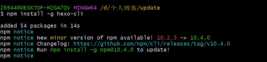 在我们存放更新后博客文件的目录下,鼠标右键打开 Git Bush Here,输入npm命令安装Hexo:
