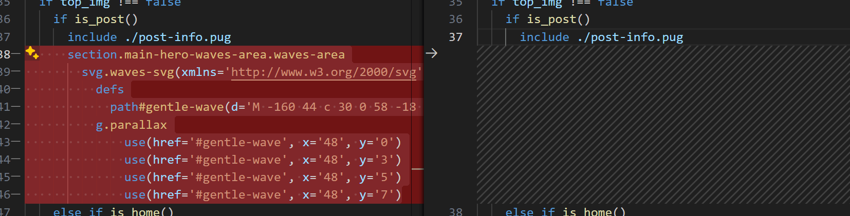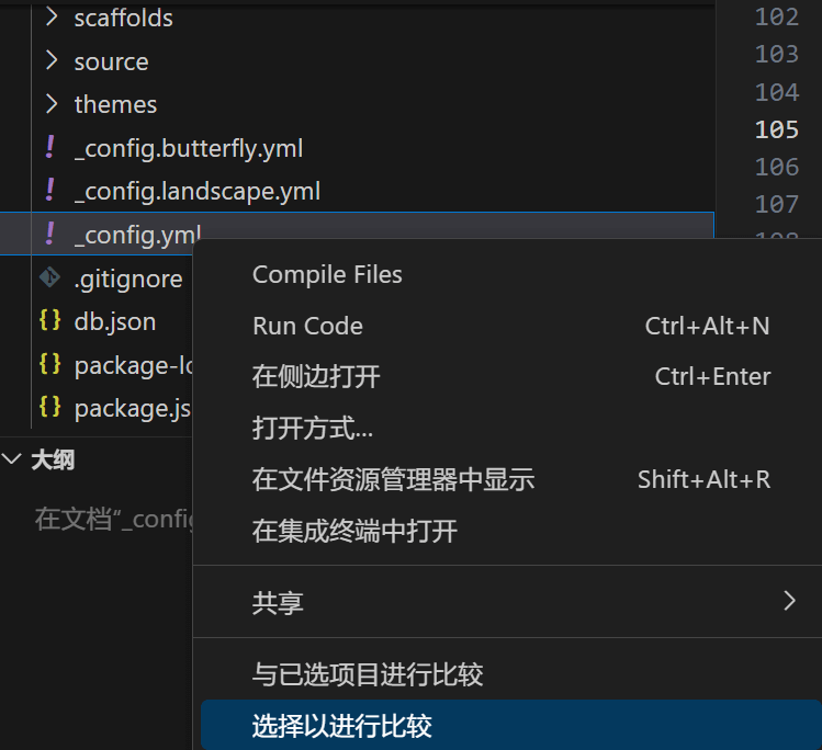 vscode自带的文件对比功能非常直观,所以我们可以利用它来修改更新后的博客配置文件