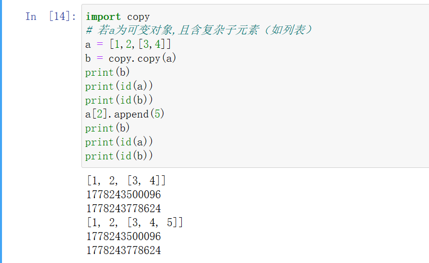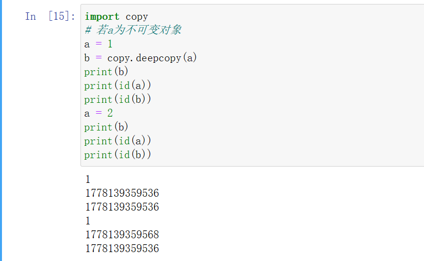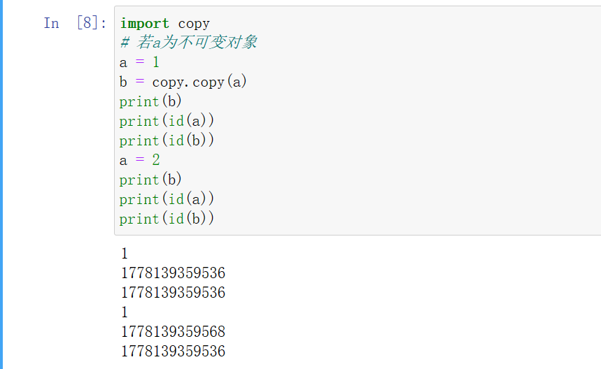 1)当浅拷贝的值是不可变对象(字符串、元组、数值类型)时和“赋值”的情况一样,对象的id值(id()函数用于获取对象的内存地址)与浅拷贝原来的值相同。