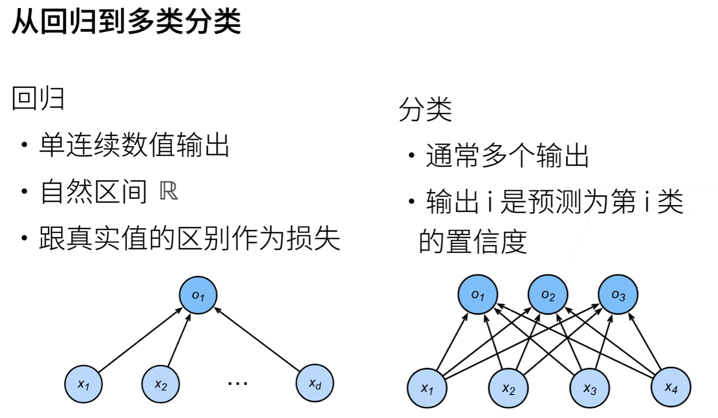$\hat{\mathbf{y}} = \mathrm{softmax}(\mathbf{o})\quad \text{其中}\quad \hat{y}_j = \frac{\exp(o_j)}{\sum_k \exp(o_k)}$